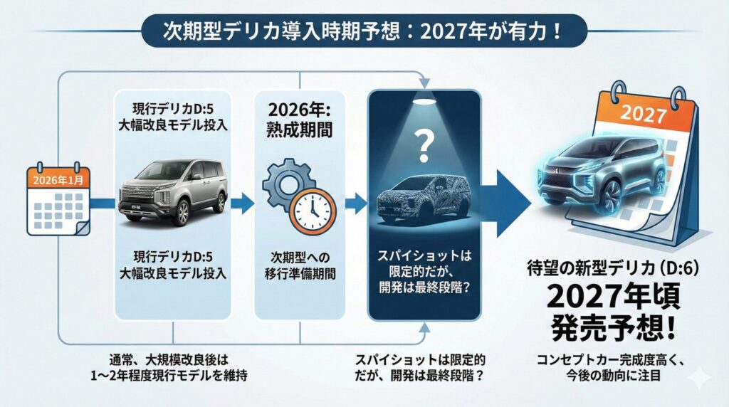 新型デリカの発売時期については、多くの専門家や市場動向から2027年頃になるという予測が有力です。その大きな根拠の一つとして、2026年1月に現行型であるデリカD:5の大幅改良モデルが投入された事実が挙げられます。