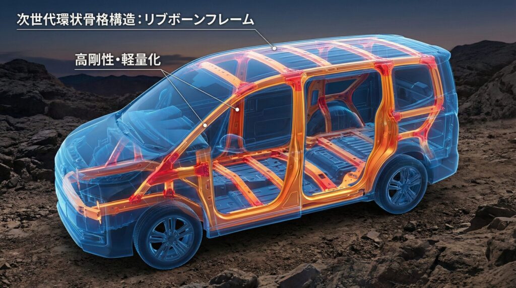 デリカの代名詞とも言える高いボディ剛性を支えてきたのが、環状骨格構造のリブボーンフレームです。次期型においても、この独自の設計思想はさらに強化された形で継承されることが明確になっています。