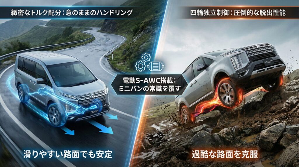 次期型デリカの走行性能における最大のトピックは、電動化されたS-AWCの搭載です。現行モデルの機械式4WDとは異なり、前後輪をそれぞれ独立したモーターで制御することにより、緻密なトルク配分が可能になります。