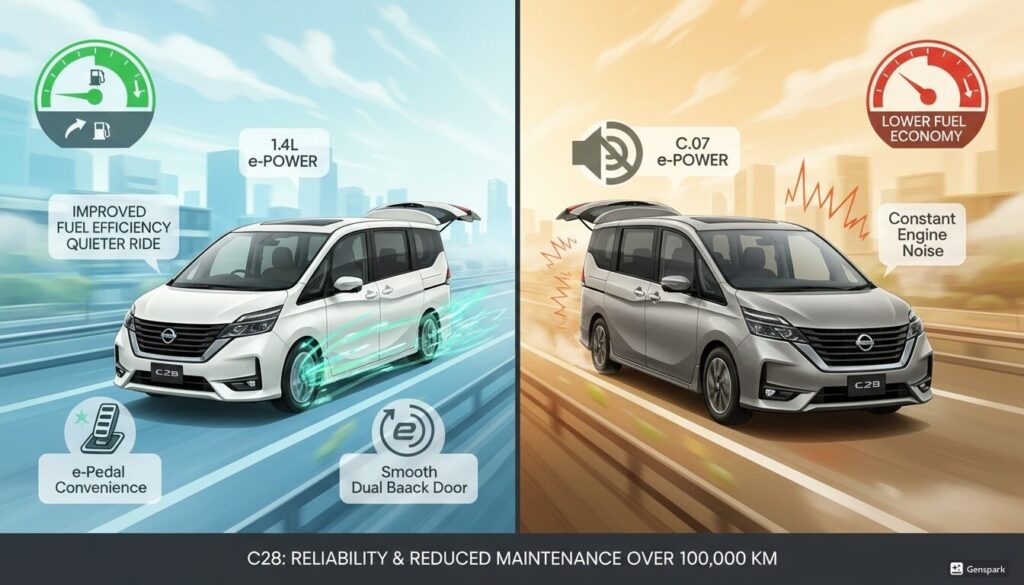 最悪と言われる理由は?といったネガティブな情報や、知恵袋の口コミを見ると、購入に踏み切れないかもしれません。特に、旧型(C27)と新型(C28)の比較、気になるバッテリー寿命や、結局何年乗れるのかという耐久性、ガソリン車とどっちが良いのか、さらにはライバルのヴォクシーどっちがいい?など、疑問は尽きないはずです。